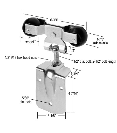 Double truck trolley assembly – Derlin wheels with ball bearings and 9-1/2" bolts for use on doors weighing up to 1000 lbs. and 16' and larger. MUST use two pair per door. Sold two pair per carton.